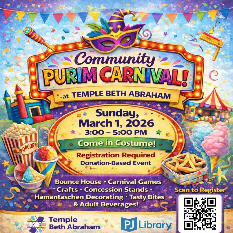 Join Temple Beth Abraham, PJ Library and Building Jewish Bridges for Purim! While this is a family-focused event, it is truly for everyone! Highlights include food, an adult beverage bar, dancing and two massage therapists offering chair massages!Plus all the kid entertainment- bubble show, face painting, a bounce house and crafts. This is a wonderful…